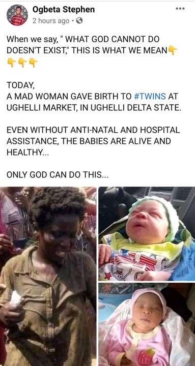 Photos of the mad woman and her twin babies was shared on social media by popular gospel musician, Ogbeta Stephen.