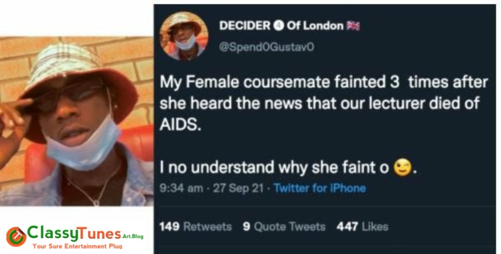 Spend0Gustav0, via the microblogging platform, narrated how an unnamed female student collapsed thrice on hearing the sad news of her lecturer’s death, who allegedly died of Acquired Immune Deficiency Syndrome (AIDS).